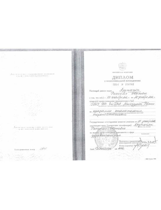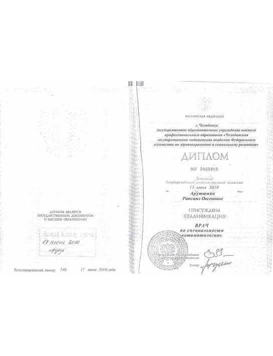 - Базовое образование: Государственное образовательное учреждение высшего профессионального образования «Челябинская государственная медицинская академия Федерального агентства по здравоохранению и социальному развитию» по специальности «Стоматология» в 2010 году.