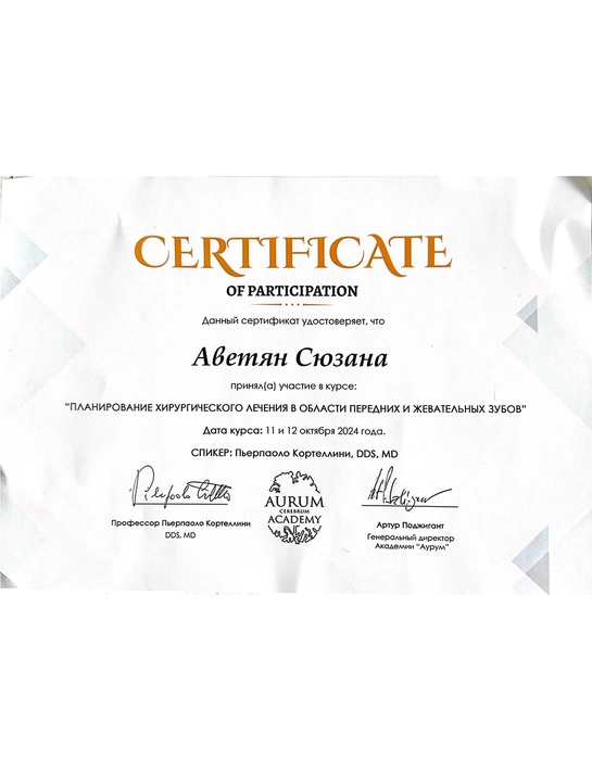 - В 2024 году приняла участие в курсе "Планирование хирургического лечения в области передних и жевательных зубов"