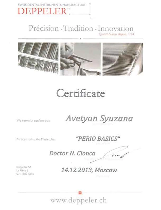 - В 2014 году получила сертификат курсов «Клиническая пародонтология. Часть II».