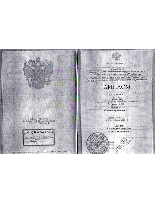 - Базовое образование: Государственное образовательное учреждение высшего профессионального образования «Челябинская государственная медицинская академия Федерального агентства по здравоохранению и социальному развитию» по специальности «Стоматология» в 2009 году.