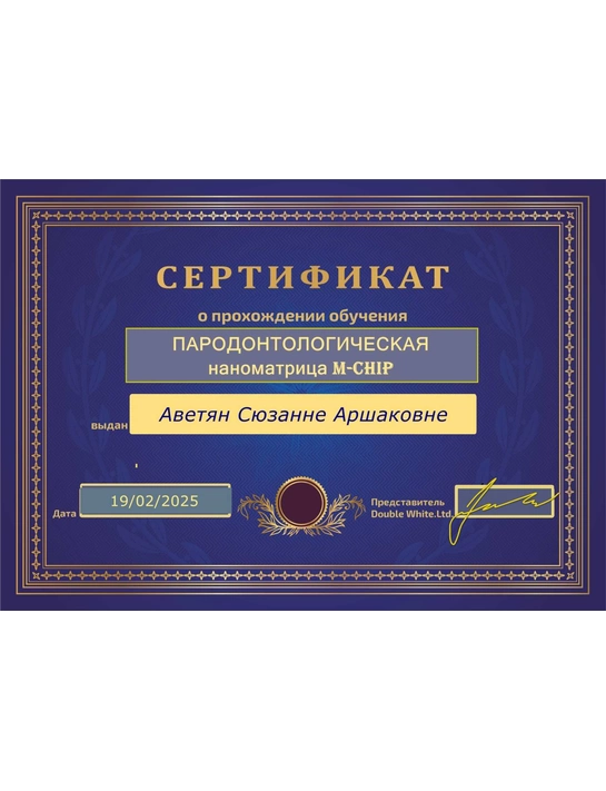 - В 2025 году прошла обучение "Пародонтологическая наноматрица M-CHIP"