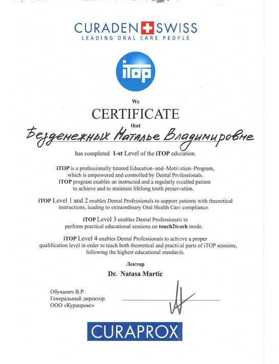- В 2014 году получила сертификат семинара «Современные методы устранения дисколоритов зубов».