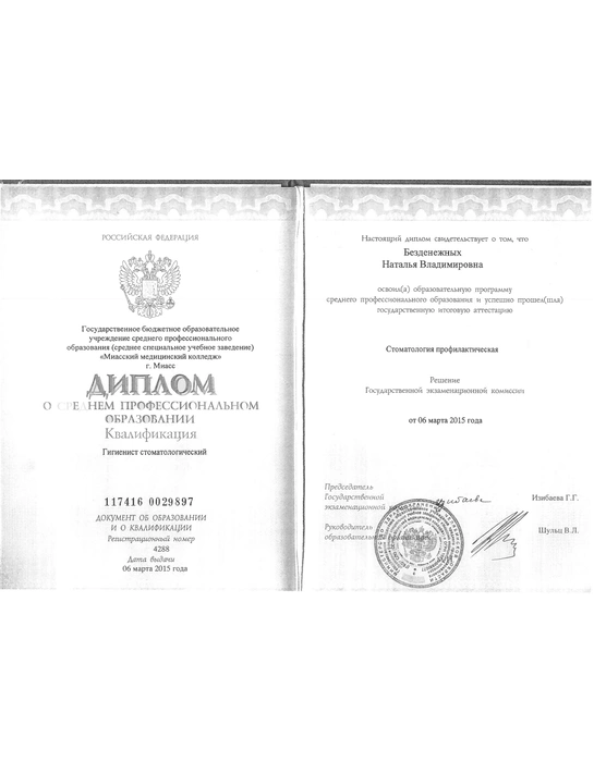 - Базовое образование: Государственное бюджетное профессиональное образовательное учреждение «Миасский медицинский колледж», квалификация «Гигиенист стоматологический» в 2015 году.