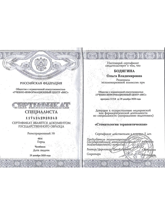 - В 2011 получила сертификат участника информационно-практического семинара «Эндодонтия от А до Я».