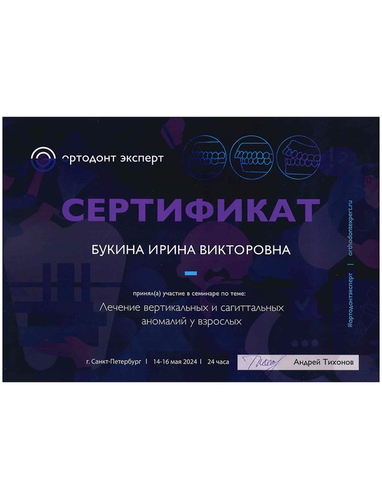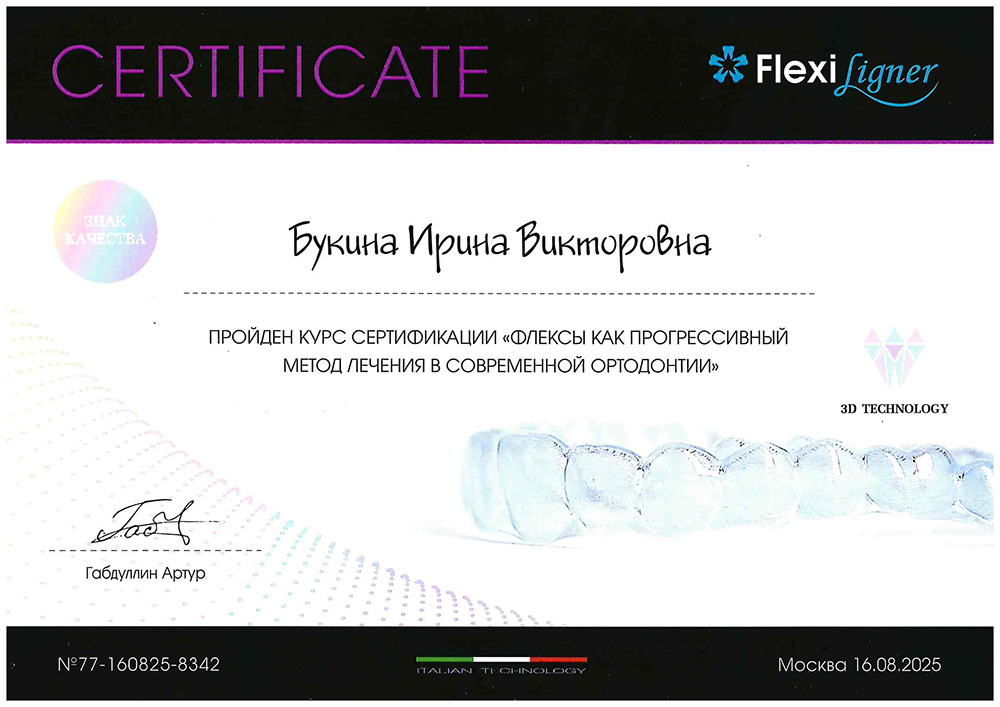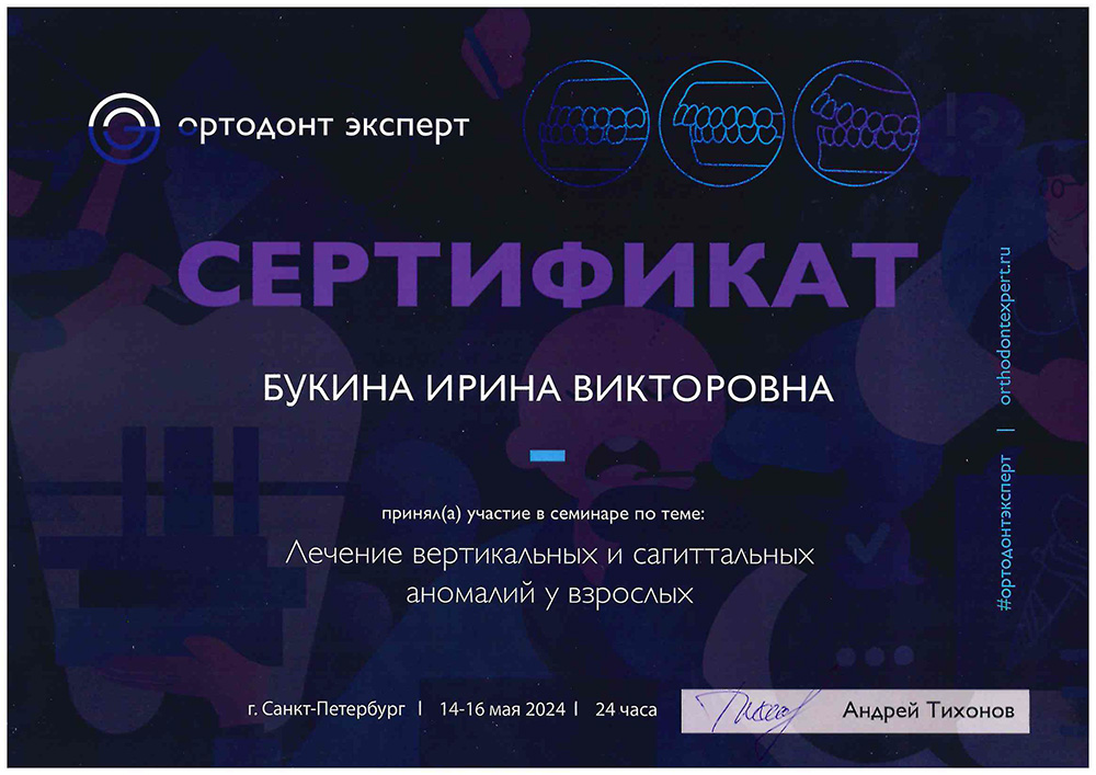 Букина Ирина Викторовна — стоматолог-ортодонт клиники Вэладент. Уже более 12 лет она помогает пациентам обрести здоровую и красивую улыбку, которой можно гордится. Ирина Викторовна всегда обсуждает разные варианты лечения — от классических брекетов до прозрачных кап. Под её контролем ортодонтическое лечение проходит качественно и эффективно, а пациента остаются довольными результатом.
