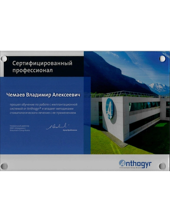 - В 2019 году получил сертификат «Принципы работы с имплантационной системой Straumann».