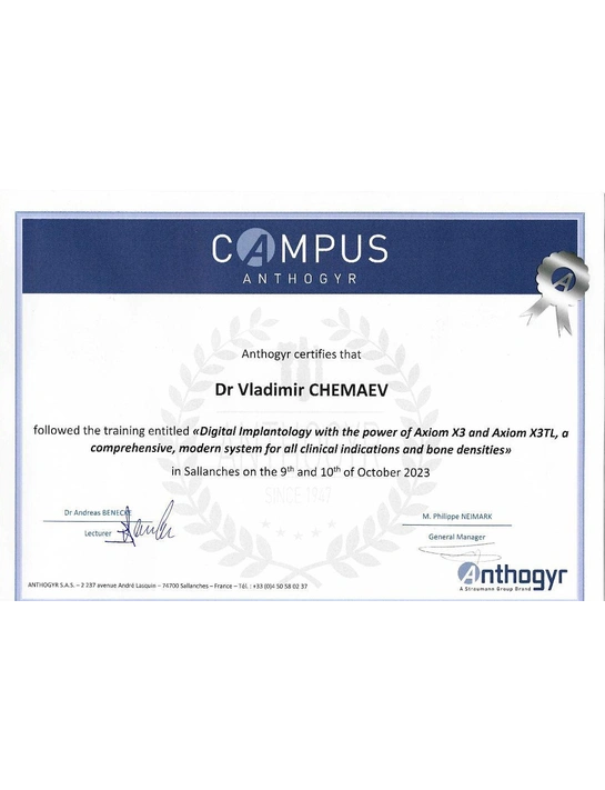 - Обучение в кампусе компании Anthogyr. Digital Implantology with a power of Axiom X3 and Axiom X3TL, a comprehensive, modern system for all clinical indications and bone densities. Andreas Benecke, г. Салланш, Франция, 2023 г.