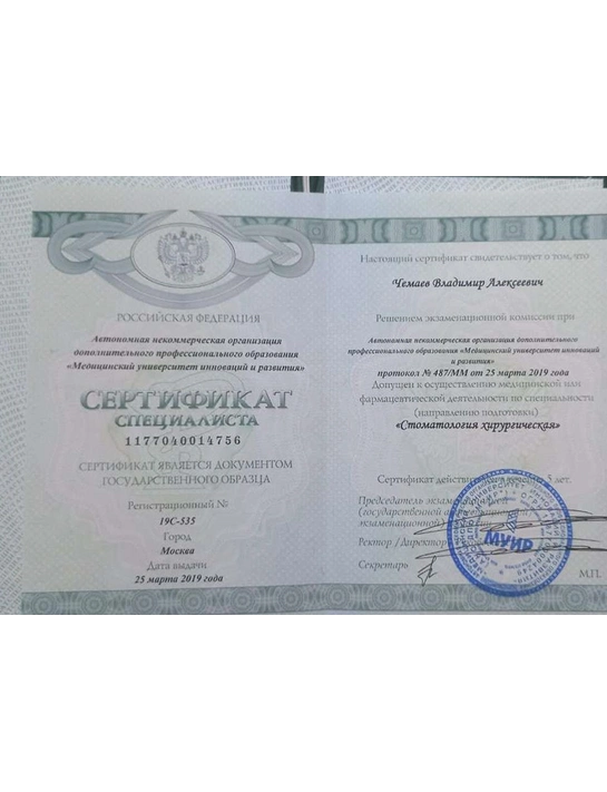 - В 2019 году получил сертификат «Современные хирургические протоколы в повседневной стоматологической практике».