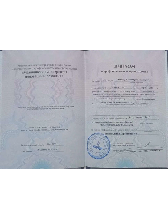 - Профессиональная переподготовка: Медицинский университет инноваций и развития (стоматология хирургическая).