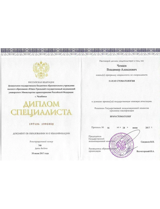 - Базовое образование: Южно-уральский Государственный Медицинский Университет по специальности «Стоматология» в 2017 году.