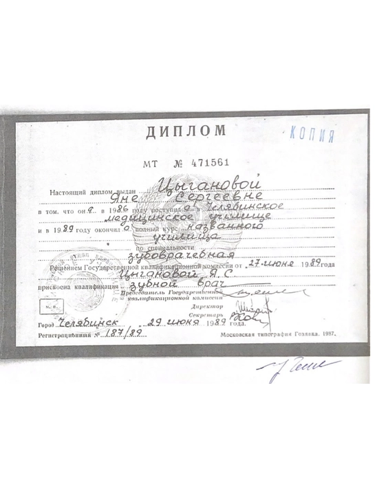- Базовое образование: Челябинское Медицинское училище по специальности «Зубной врач» в 1989 году.