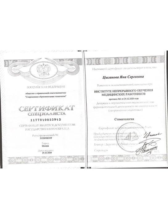 - В 2004 году получила удостоверение о повышении квалификации по программе «Реставрация зубов с использованием современных материалов».