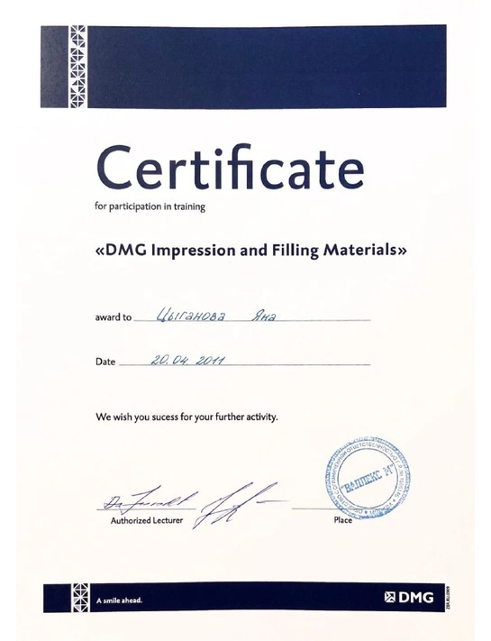 - В 2012 году получила сертификат учебного цикла и мастер-класса «Современные концепции в эндодонтическом лечении первичных и молодых зубов».
