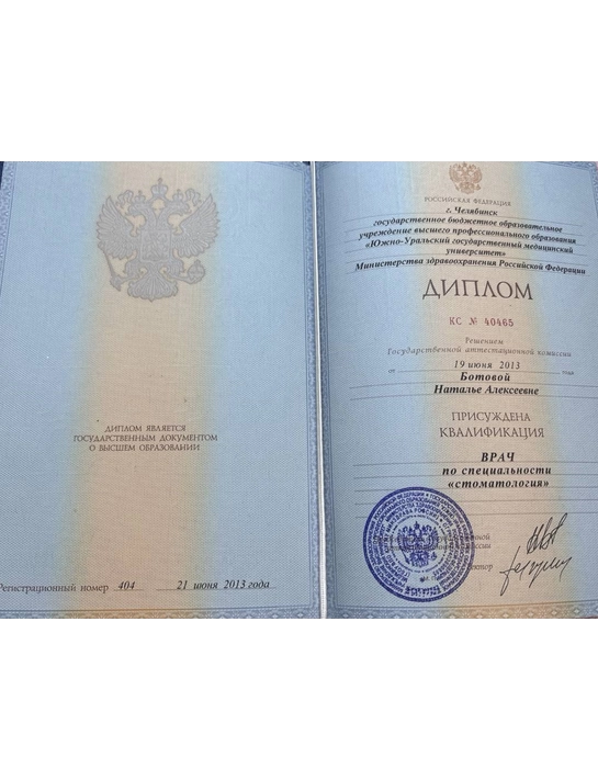 - Базовое образование: Южно-Уральский государственный медицинский университет по специальности «Стоматология» в 2013 году.