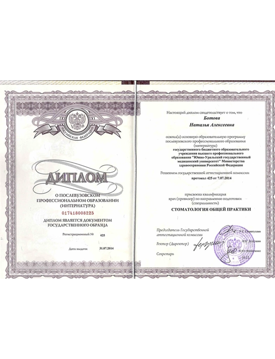 - Интернатура: Южно-Уральский государственный медицинский университет по специальности «Стоматология общей практики» в 2014 году.