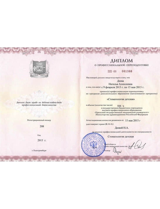 - Профессиональная переподготовка: Южно-Уральский государственный медицинский университет по специальности «Стоматология детская» в 2015 году.