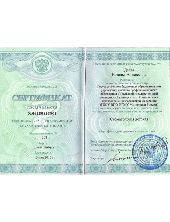 - В 2015 году получила сертификат семинара на тему «Восстановление молочных зубов при помощи металлических коронок 3М», г. Екатеринбург.