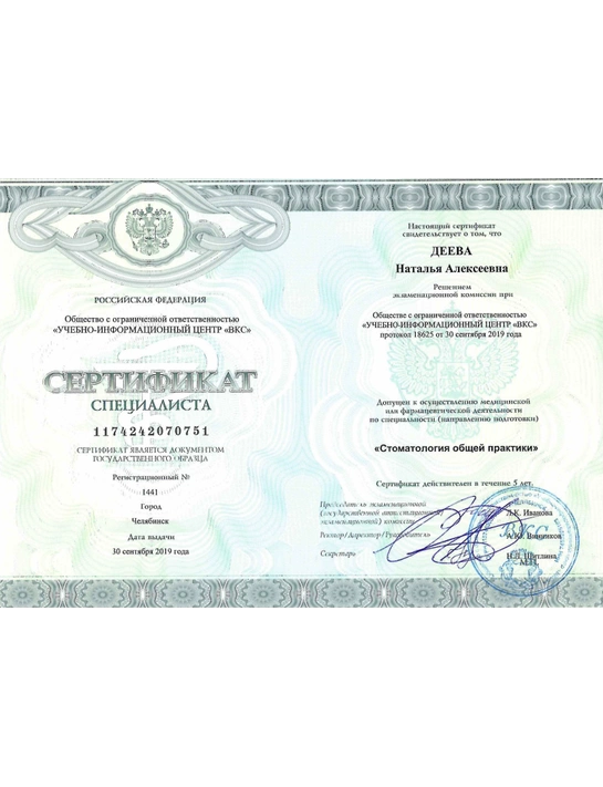 - В 2018 году получила сертификат – «Эндодонтическое лечение постоянных зубов», г. Екатеринбург.