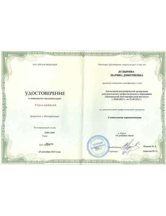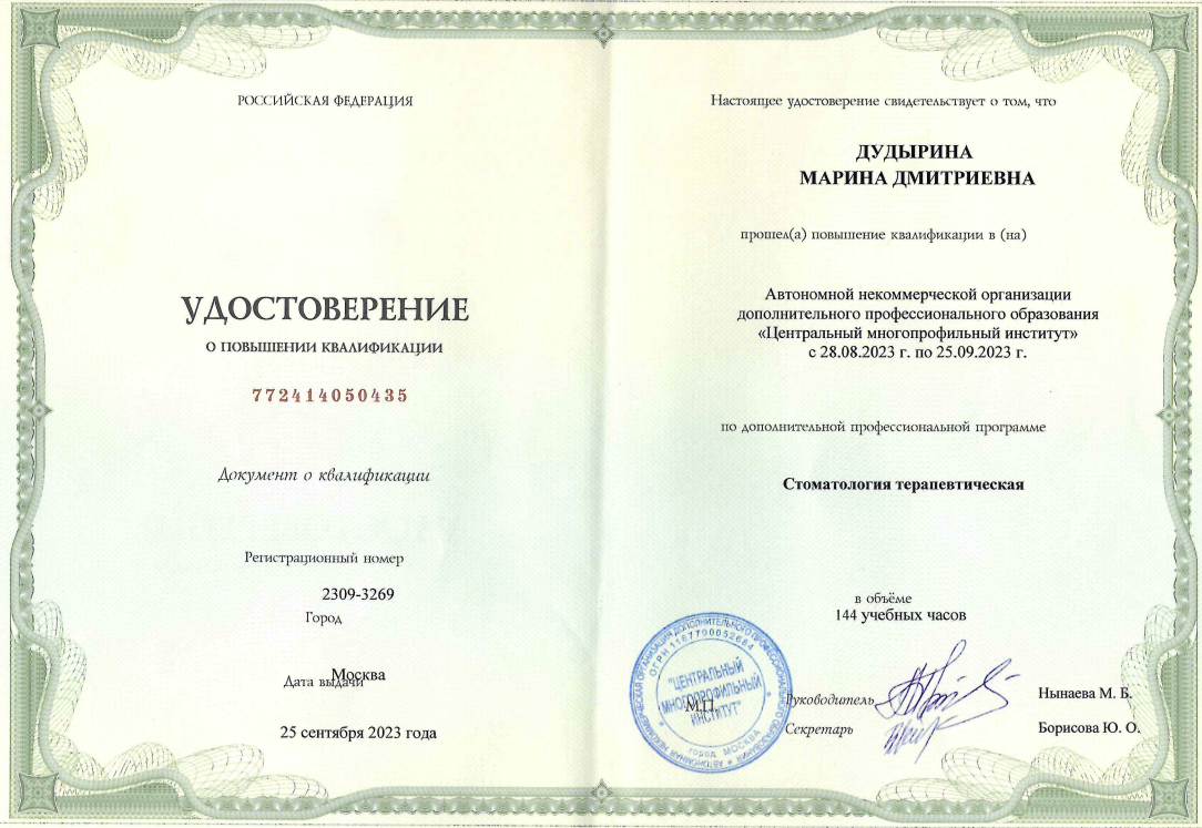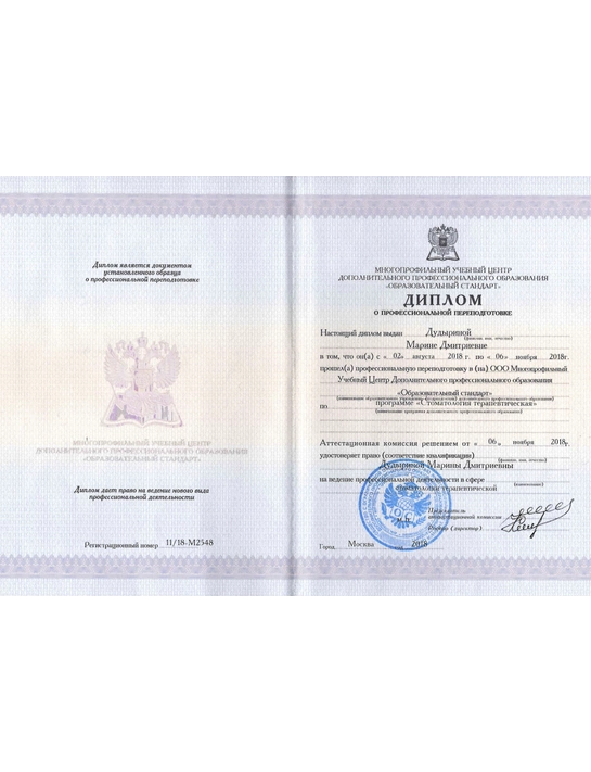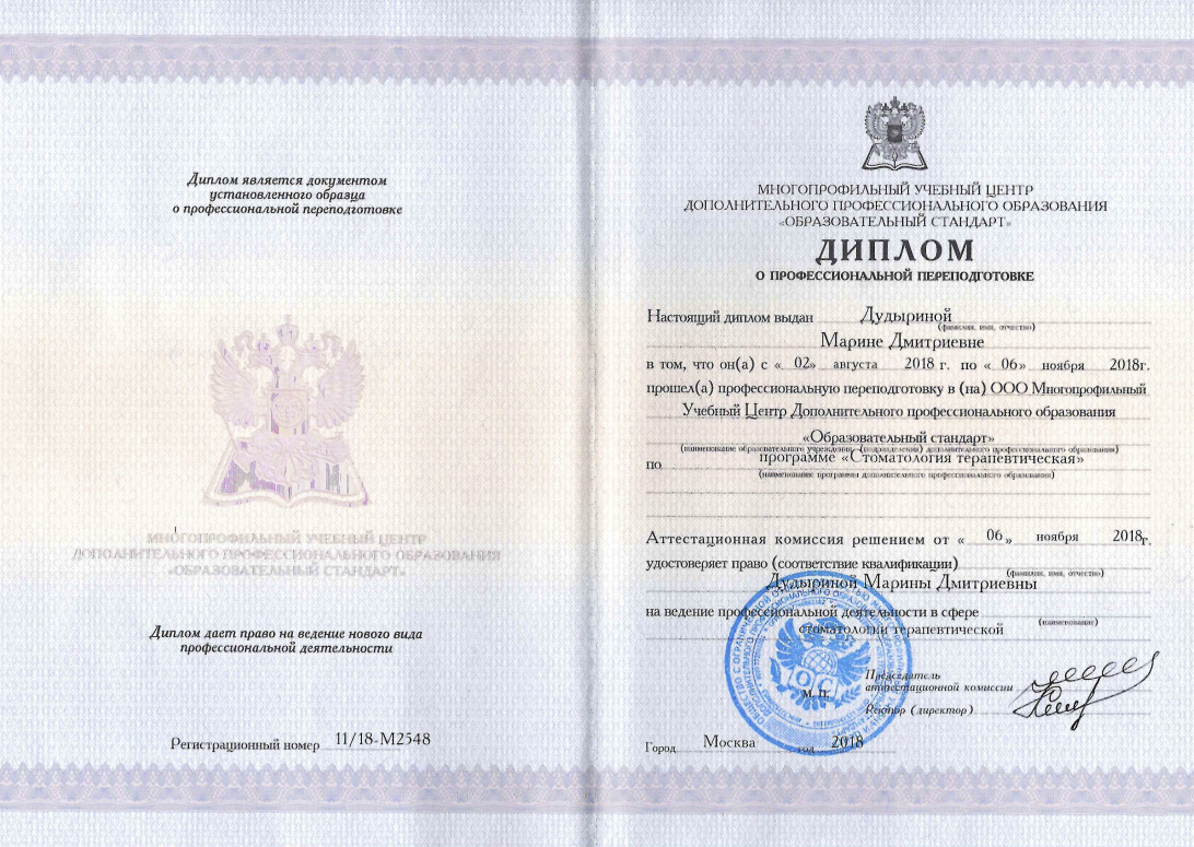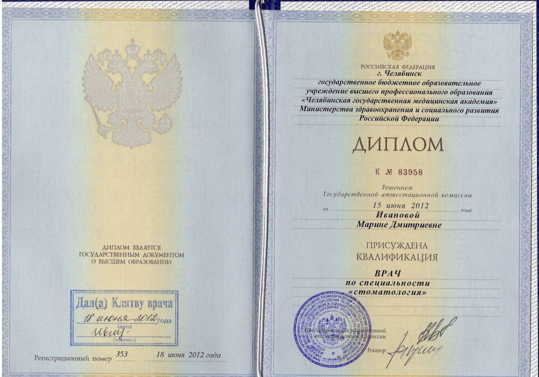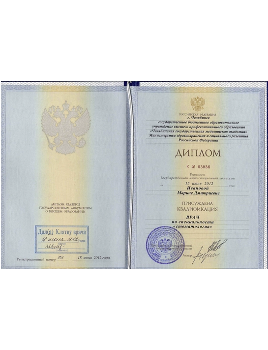 - Базовое образование: Государственное образовательное учреждение высшего профессионального образования «Челябинская государственная медицинская академия Федерального агентства по здравоохранению и социальному развитию» по специальности «Стоматология» в 2012 году.