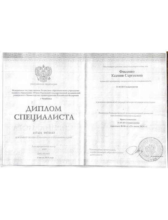 - Базовое образование: Южно-уральский Государственный Медицинский Университет по специальности «Стоматология» в 2024 году.