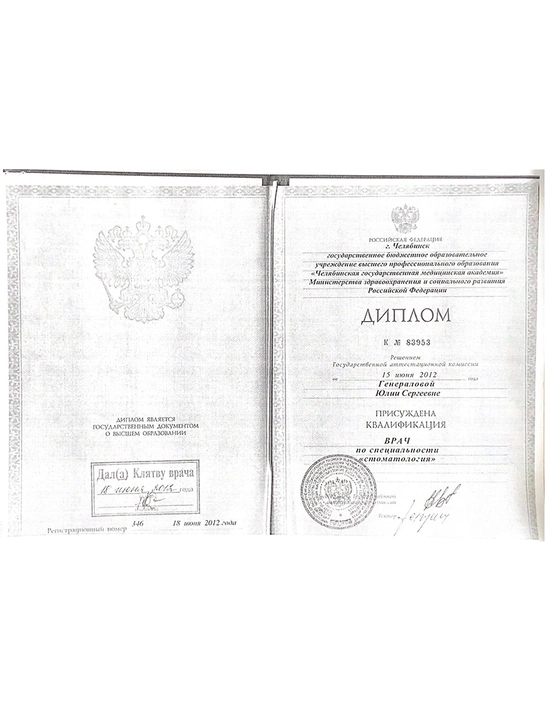 - Базовое образование: Государственное образовательное учреждение высшего профессионального образования «Челябинская государственная медицинская академия Федерального агентства по здравоохранению и социальному развитию» по специальности «Стоматология» в 2012 году.