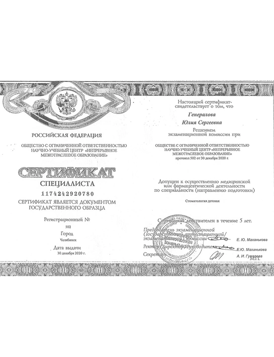 - В 2018 году прошла практический курс повышения квалификации по миофункциональной ортодонтии «Диагностика и лечение миофункциональных нарушений».