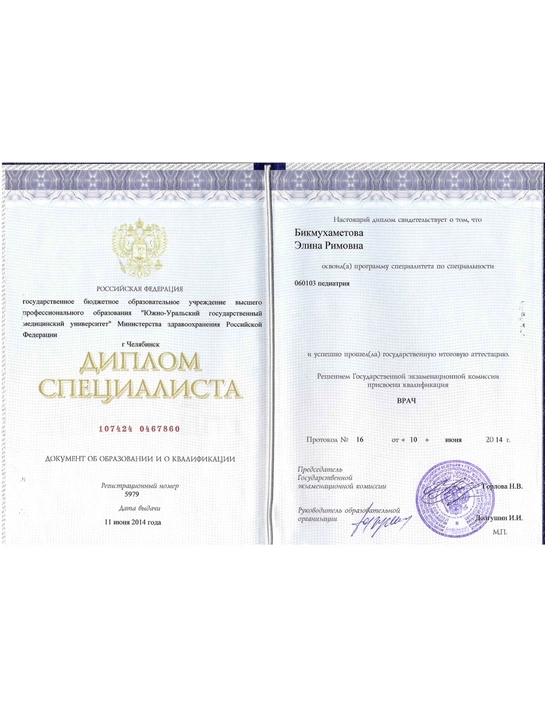- Базовое образование: Южно-уральский Государственный медицинский университет по специальности «Педиатрия» в 2014 году, квалификация «Врач».