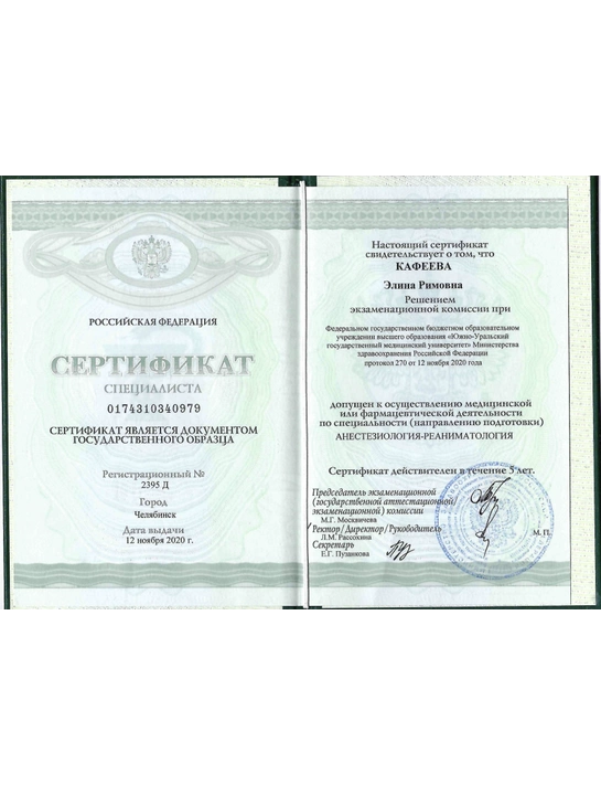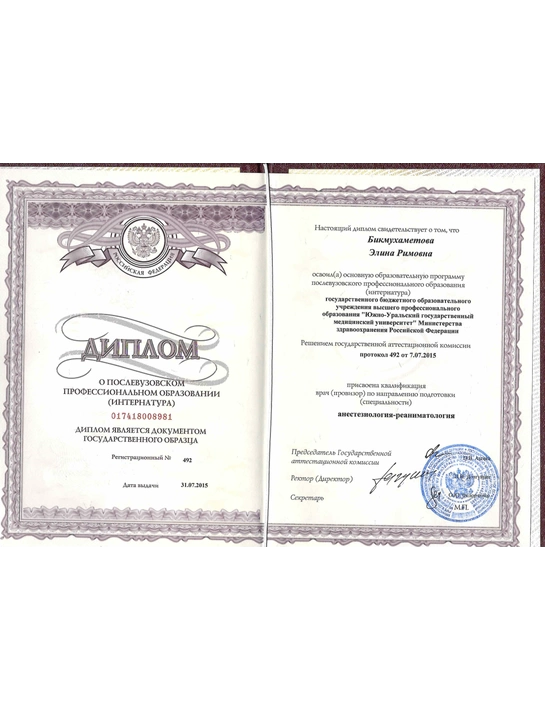 - Послевузовое профессиональное образование(интернатура): Южно-уральский Государственный медицинский университет по специальности «Анестезиология-реаниматология» в 2015 году.
