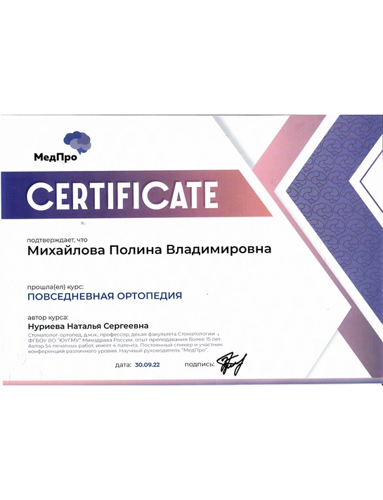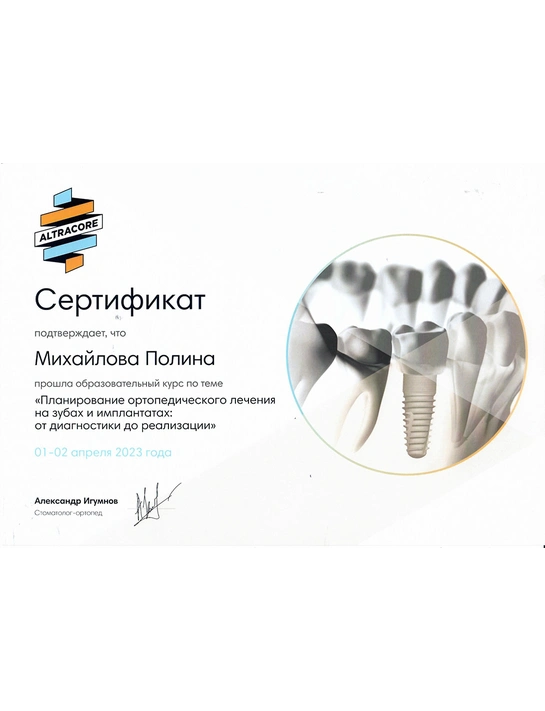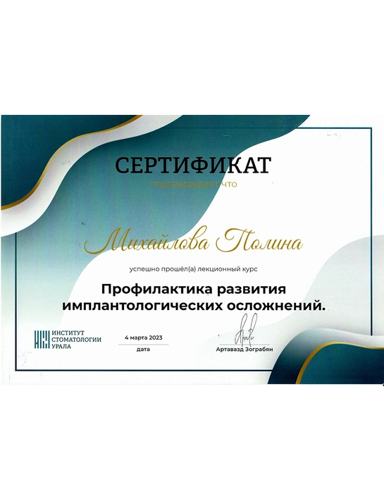 - В 2023 году участвовала в "Профилактика развития имплантологических осложнений".