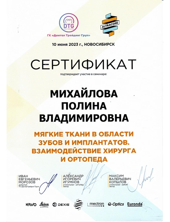 - В 2023 году участвовала в "Мягкие ткани в области зубов и имплантов. Взаимодействие хирурга и ортопеда".