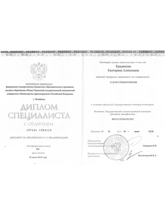 - Базовое образование: Южно-уральский Государственный Медицинский Университет по специальности «Стоматология» в 2018 году.
