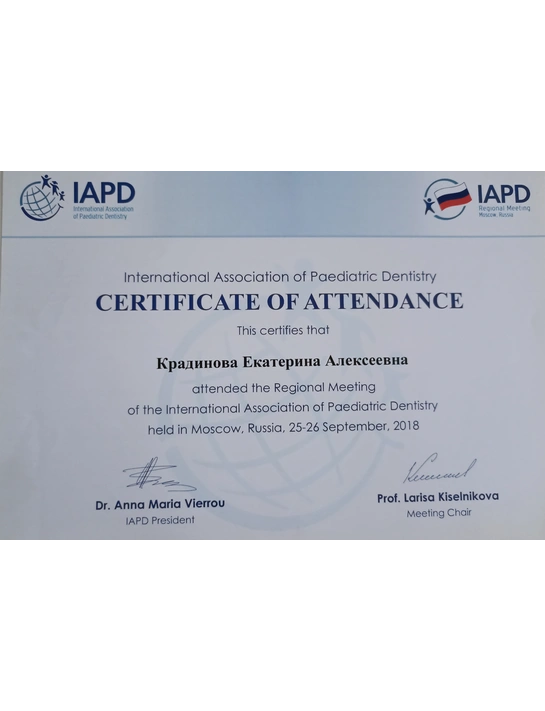 - В 2019 году получила сертификат семинара «Детская стоматология: эндодонтия постоянных несформированных зубов».
