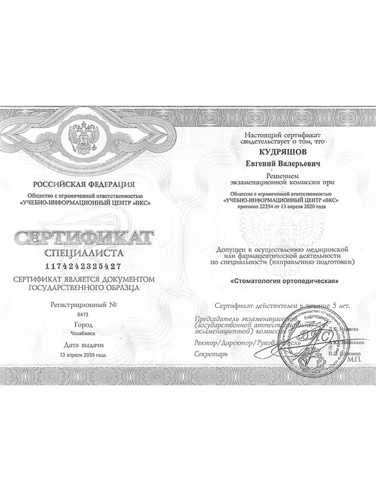 - В 2014 году получил сертификат об участии в семинаре «Планирование ортопедического лечения».