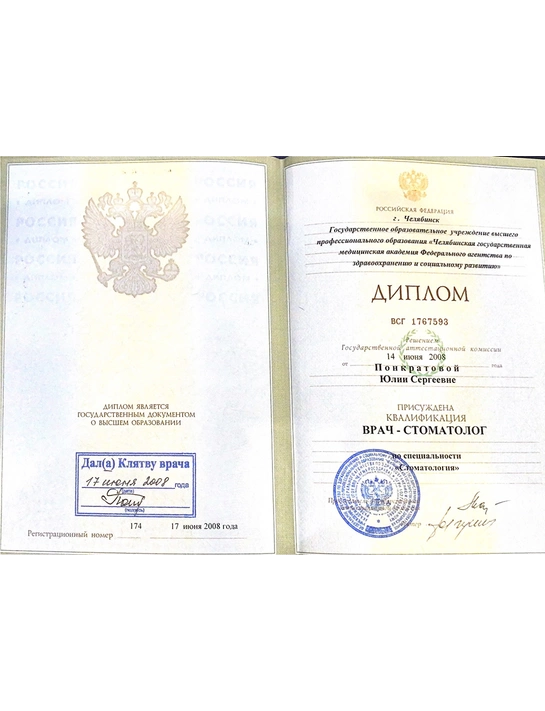 - Базовое образование: Южно-уральский Государственный Медицинский Университет по специальности «Стоматология» в 2008 году.