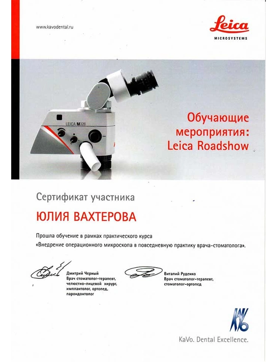 - В 2016 году получила сертификат курса «Cerec: продвинутые технологии, основы работы».
