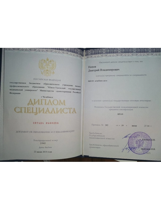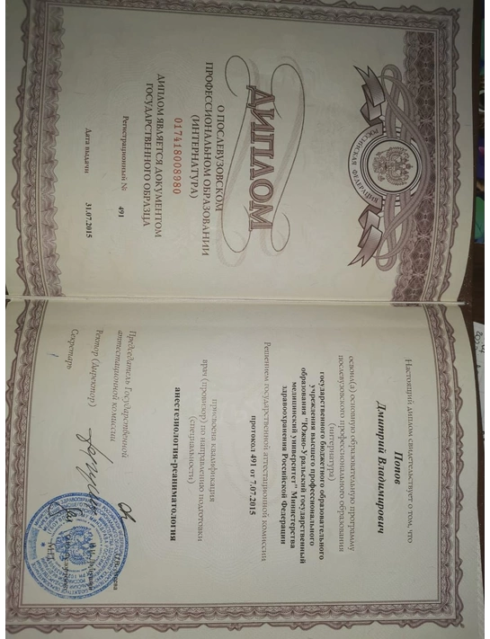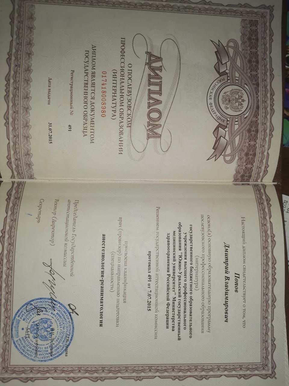 - Интернатура: Южно-уральский Государственный Медицинский Университет по специальности «Анестезиология-реаниматология» в 2015 году.