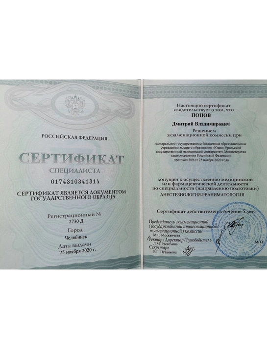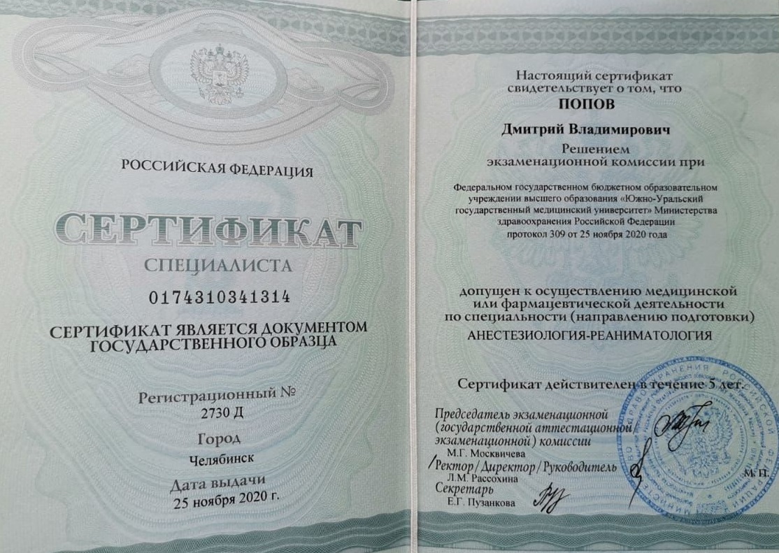 - Повышение квалификации: Южно-уральский Государственный Медицинский Университет по специальности «Анестезиология-реаниматология» в 2020 году.