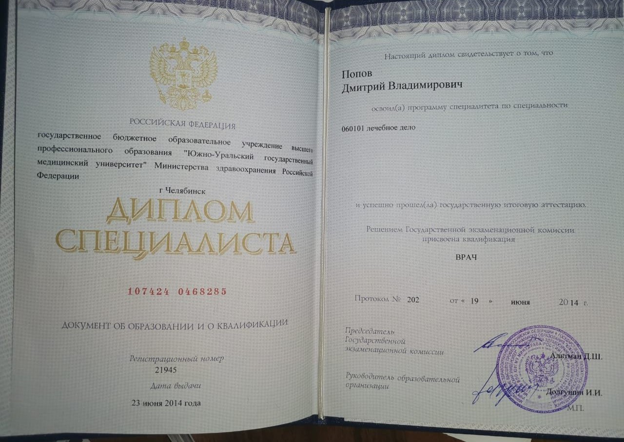 - Базовое образование: Южно-уральский Государственный Медицинский Университет по специальности «Стоматология» в 2014 году.