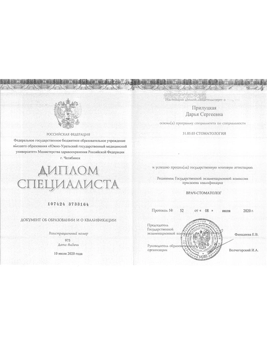 - Базовое образование: Южно-уральский Государственный Медицинский Университет по специальности «Стоматология» в 2020 году.