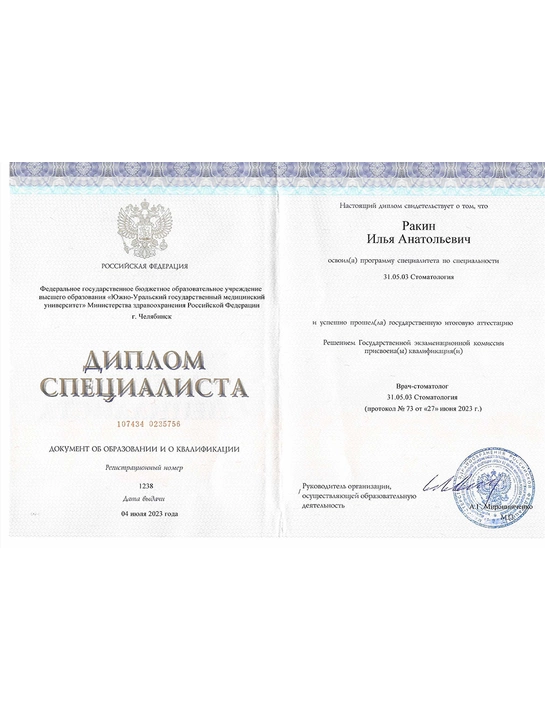 - Базовое образование: Южно-уральский Государственный Медицинский Университет по специальности «Стоматология» в 2023 году.