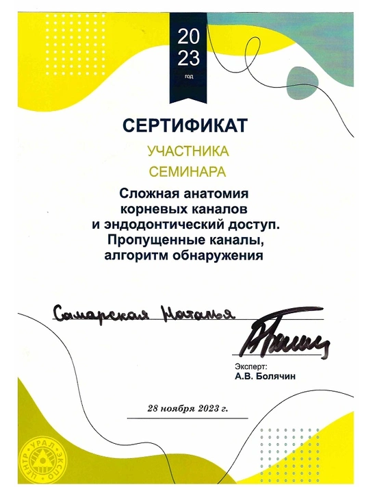 - В 2022 году получила сертификат курса «Лечение апикального периодонтита».