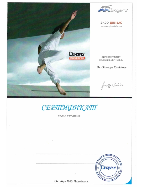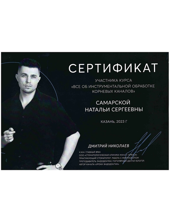 - В 2015 году получил сертификат обучения «Пломбирование корневых каналов с использованием разогретой гуттаперчи».