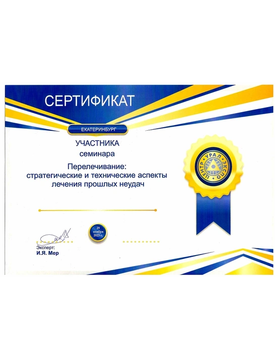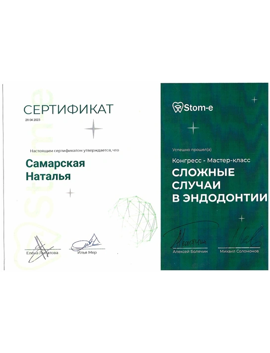 - В 2017 году получила сертификат обучения «Эндодонтия №3. Перелечивание (ортоградная ревизия). Клинические решения и техники».