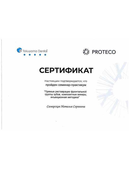 - В 2011 году получила сертификат семинар «Прямая реставрация зубов. Алгоритм восстановления фронтальной группы зубов».