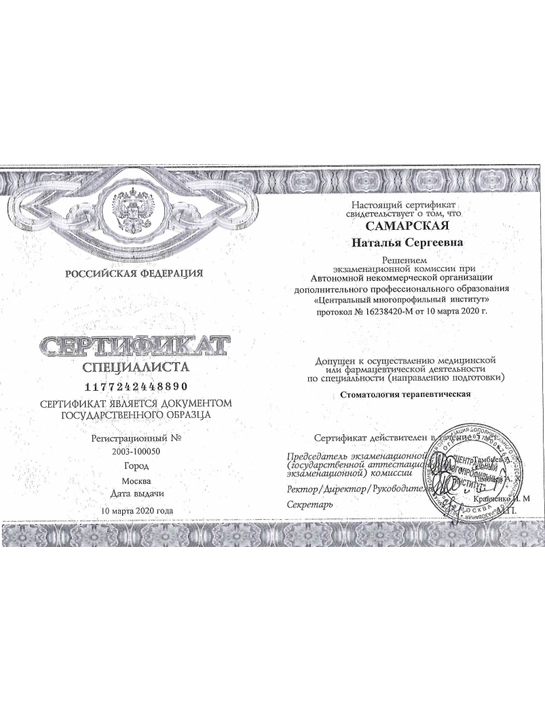 - В 2020 году получила сертификат курса «Лучевая диагностика в амбулаторной практике врача-стоматолога».