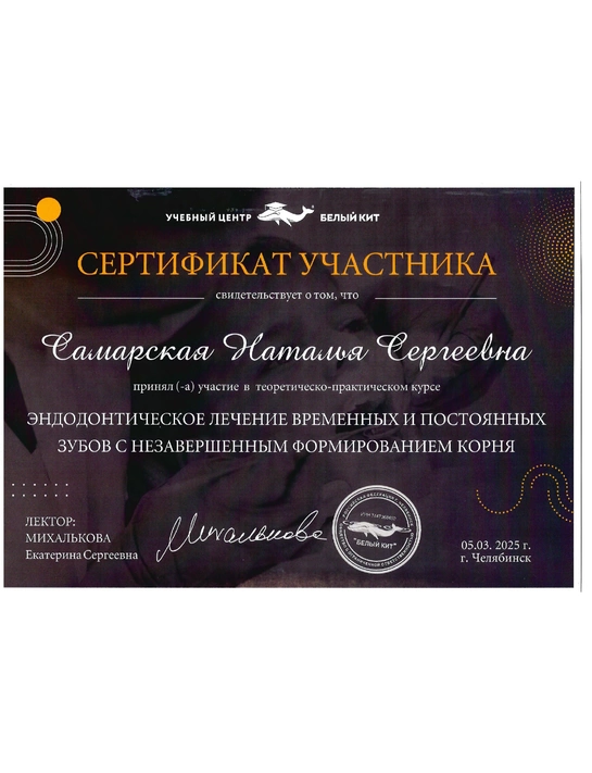- В 2018 году получила сертификат обучения «Эндодонтия №4».