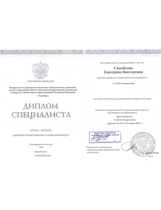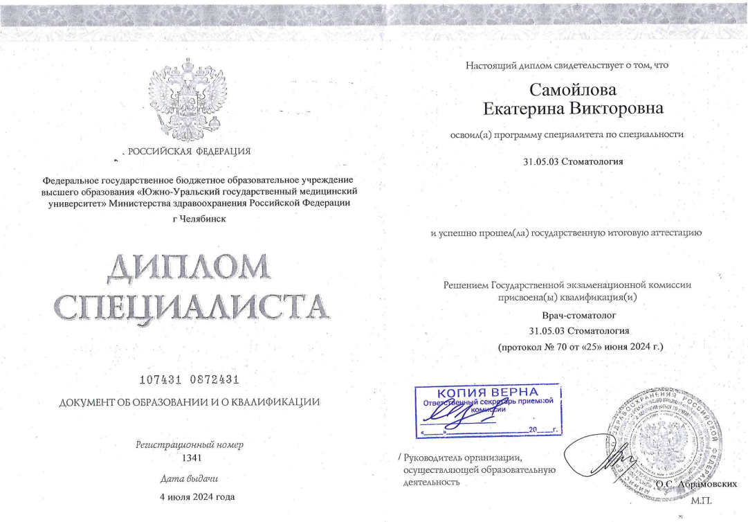 - Базовое образование: Южно-уральский Государственный Медицинский Университет по специальности «Стоматология» в 2024 году.