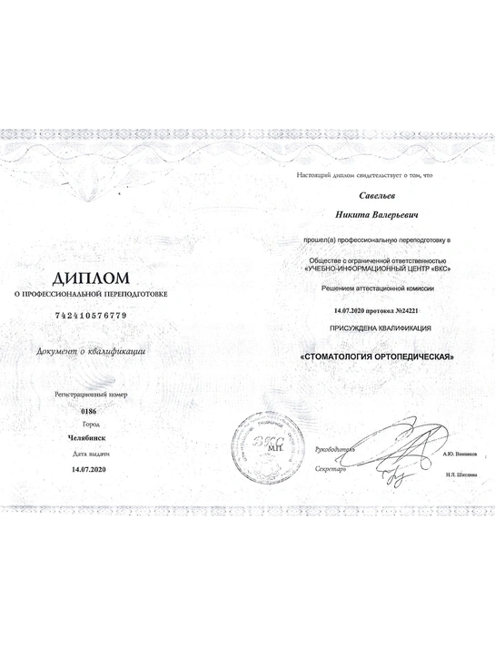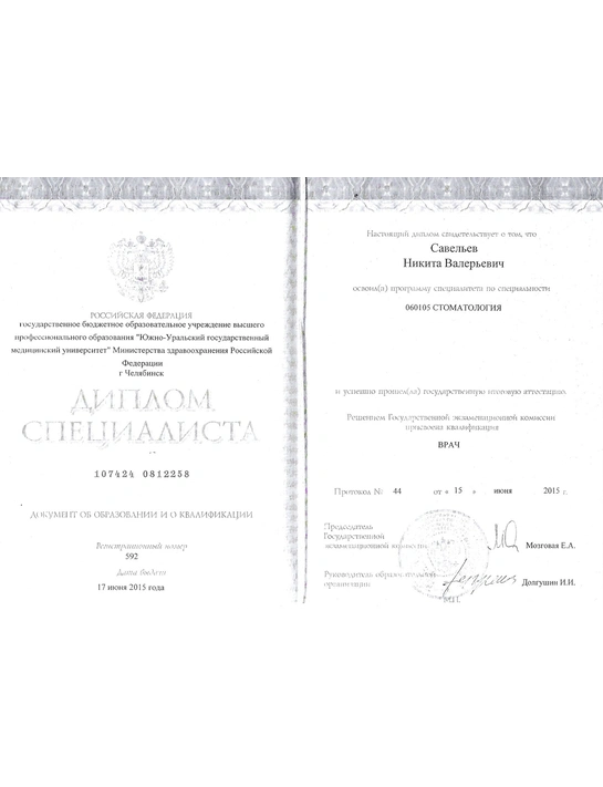- Базовое образование: Южно-уральский Государственный Медицинский Университет по специальности «Стоматология» в 2015 году.