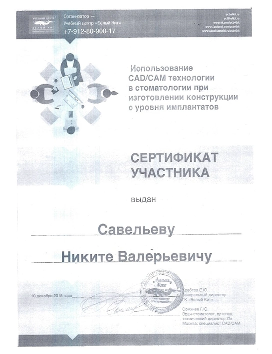 - В 2015 году прошёл обучение на курсе - «Использование CAD/CAM технологии в стоматологии при изготовлении конструкции с уровня имплантов», Челябинск
