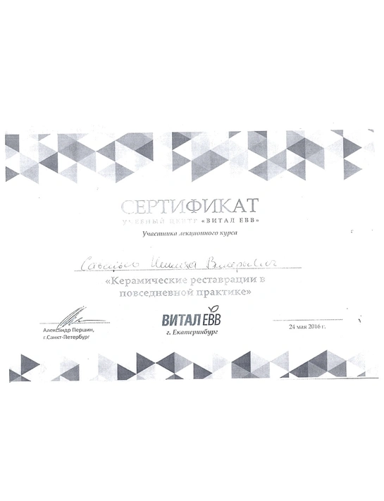 - В 2016 году прошёл обучение на курсе - «Керамические реставрации в повседневной практике», Екатеринбург